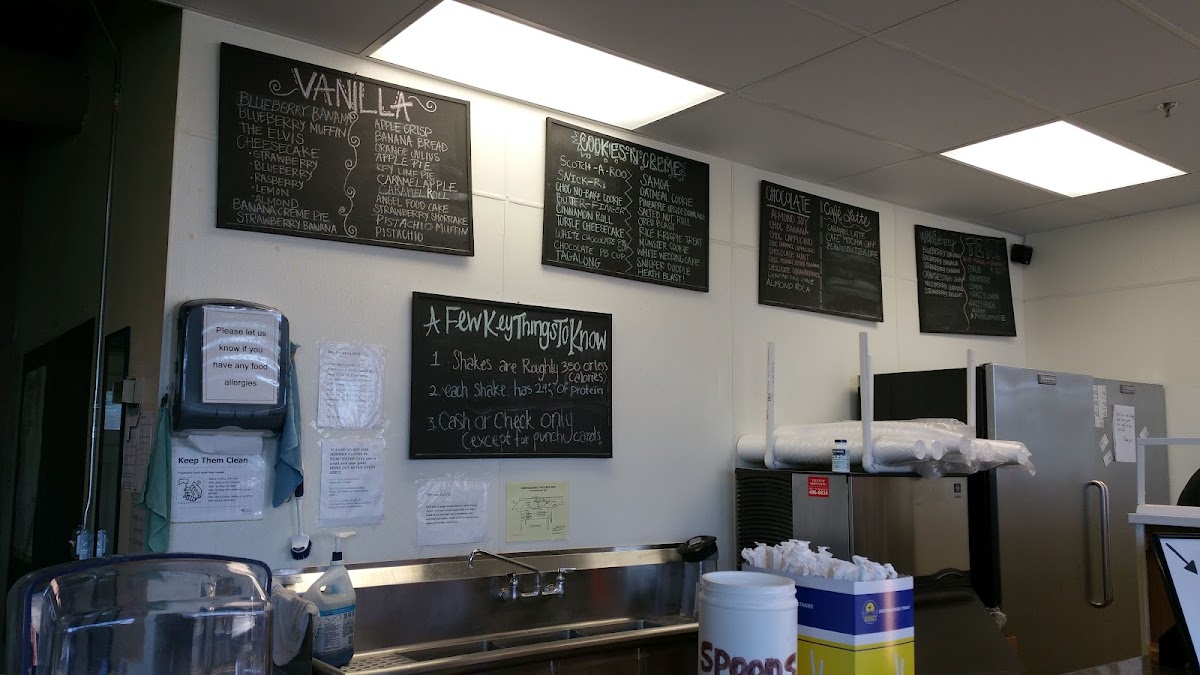 The menu at this cafe primarily features a variety of smoothies and shakes, alongside a selection of teas. These offerings cater to visitors seeking nutritious and sizeable portions, suitable for light meals, snacks, or refreshments between activities such as games or athletic sessions. The menu is designed for quick ordering and casual consumption.